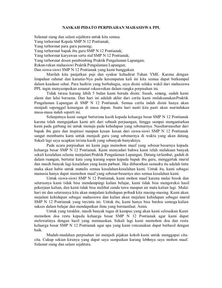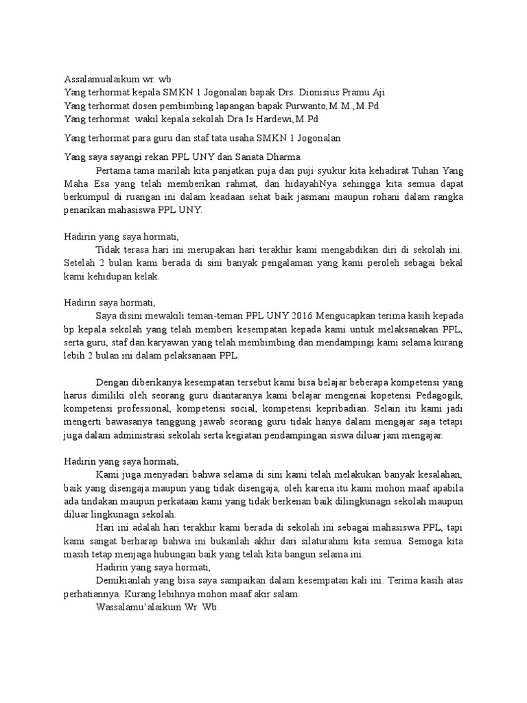 Kata sambutan perpisahan ppl praktek pengalaman lapangan december 20 2017 klikharry kata sambutan kata sambutan perpisahan 0 praktek pengalaman lapangan atau yang juga dikenal dengan singkatan ppl adalah suatu program mata kuliah proses pembelajaran yang menjadi persyaratan dalam pendidikan prajabatan guru.