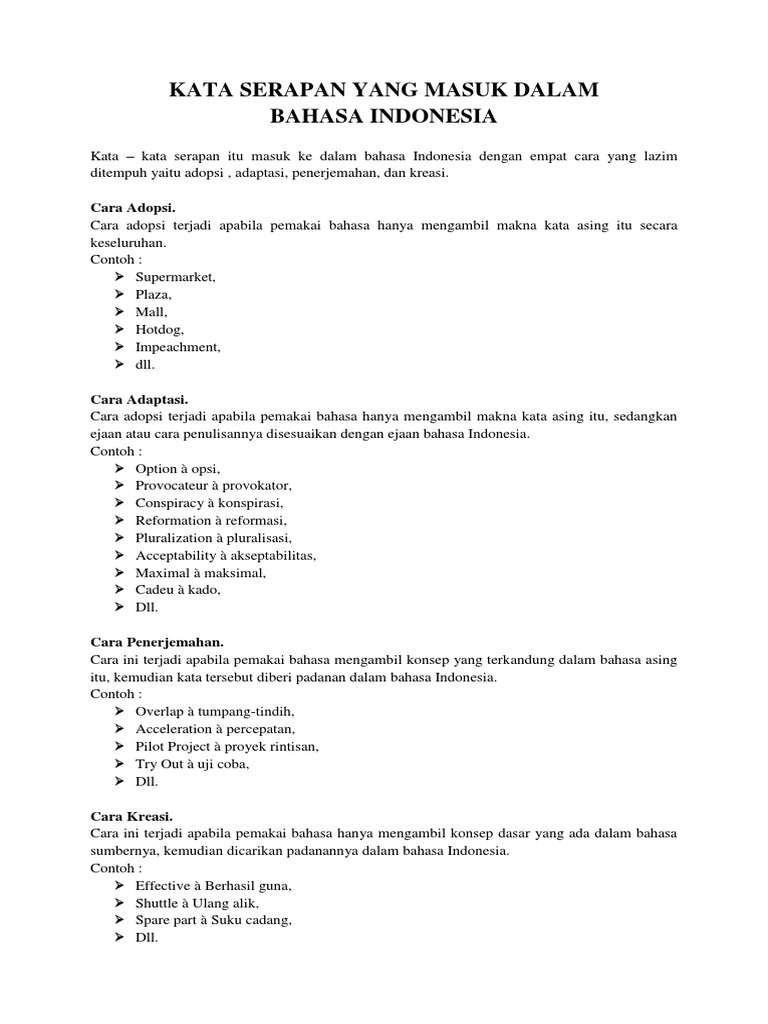 Setiap masyarakat bahasa memiliki tentang cara yang digunakan untuk mengungkapkan gagasan dan perasaan atau untuk menyebutkan atau mengacu ke benda benda di sekitarnya. Contoh kata serapan dan pengertiannya adopsi adaptasi pungutan kata serapan atau sering disebut juga dengan kata pungutan atau pinjaman adalah kata kata yang berasal dari bahasa asing yang telah terintegrasi ke dalam bahasa indonesia dan telah diterima luas oleh masyarakat umum. Contoh kata serapan juga dapat diambil dari bahasa bahasa negara lain kemudian diubah menjadi pengucapan bahasa indonesia.