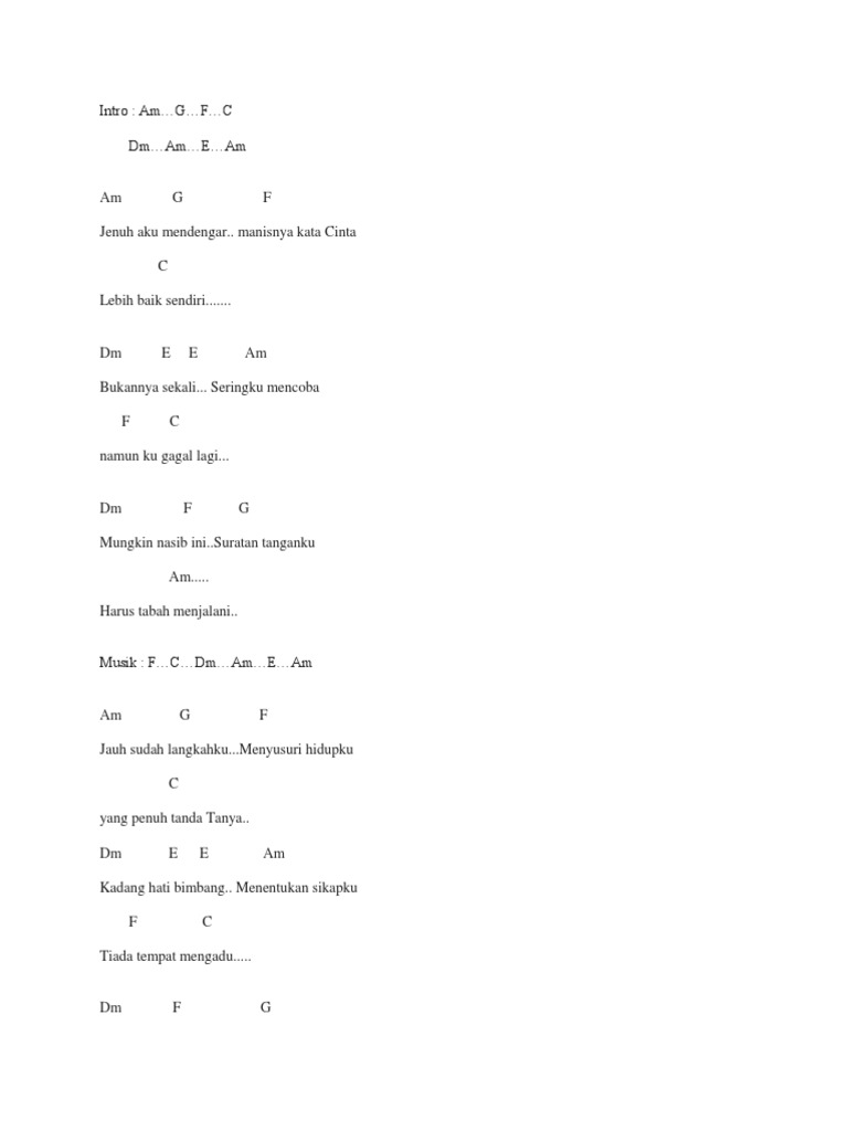 Jenuh aku mendengar manisnya kata cinta lebih baik sendiri bukannya sekali seringku mencoba namun kugagal lagi hanya iman di dada. Em d jenuh aku mendengar c manisnya kata cinta g lebih baik sendiri am b bukannya sekali em ingin ku mencoba c g namun ku gagal lagi. Bila cinta mulai bersemi.
