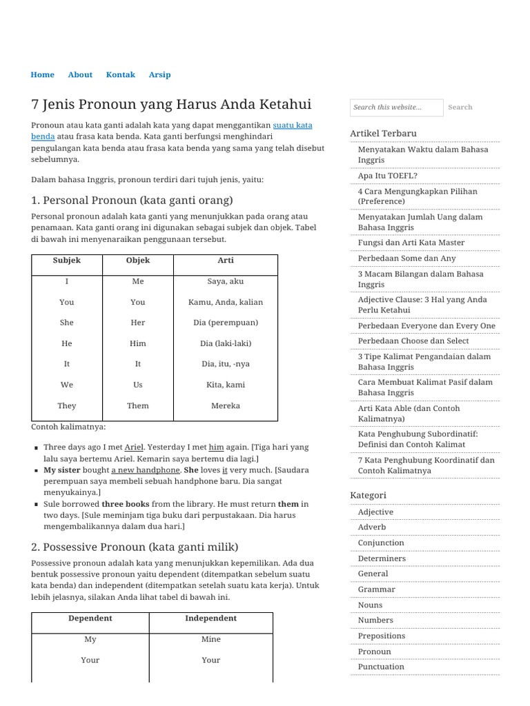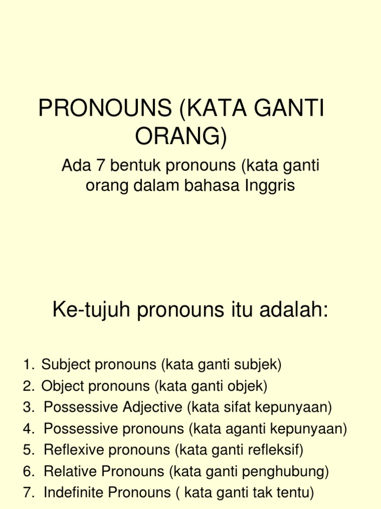 63 daftar kata ganti dalam bahasa inggris pronoun jenis arti contoh kalimat lengkap sponsors link pronouns adalah kata ganti untuk noun atau dalam bahasa indonesia adalah kata ganti orang. Pronouns kata ganti dalam bahasa inggris dan contohnya pronoun kata ganti merupakan kata atau bentuk sebagai pengganti kata benda atau frase kata benda. Kata ganti orang ini digunakan sebagai subjek dan objek.