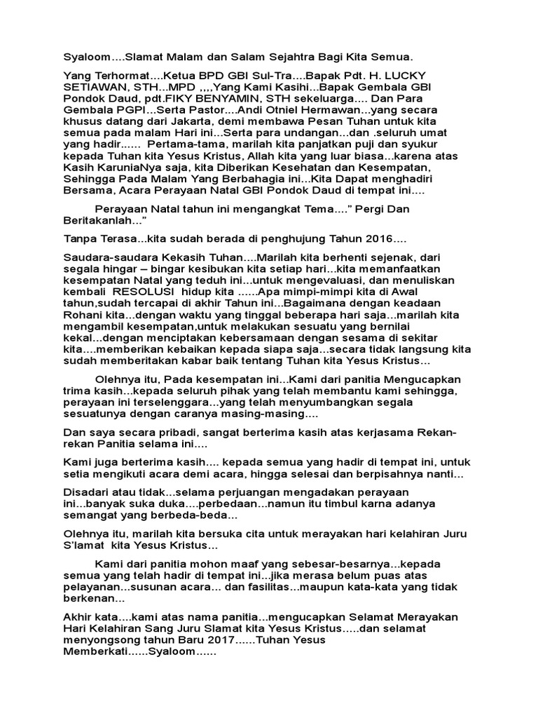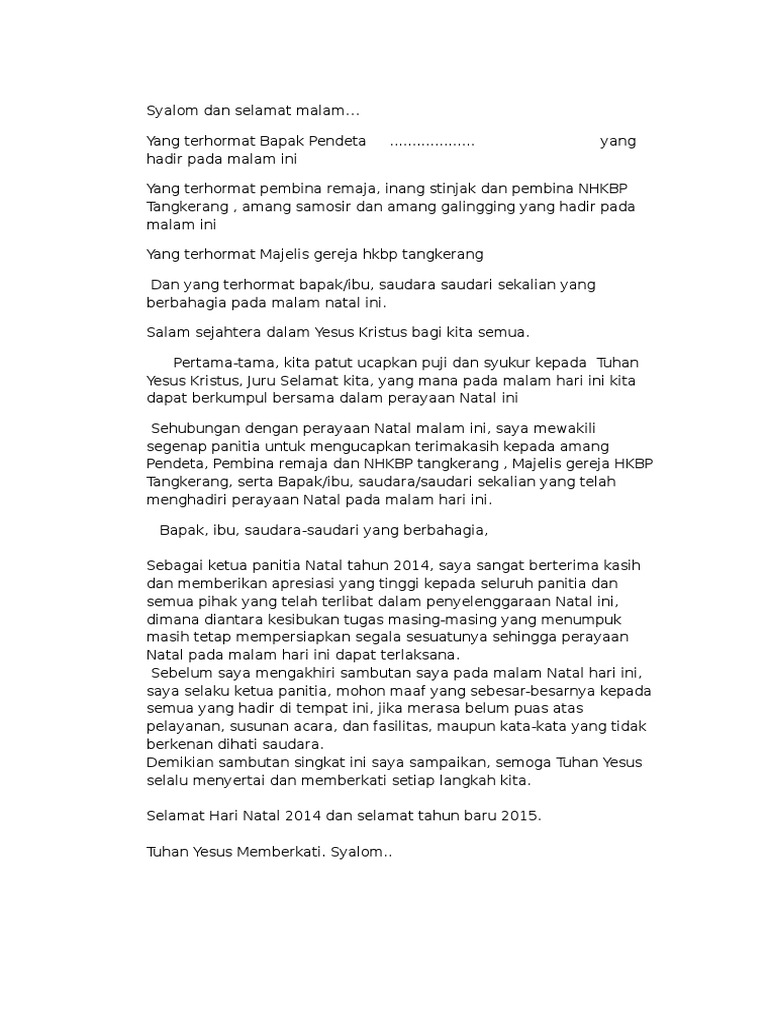 Kata sambutan ketua panitia natal. Sambutan juga biasanya dibawakan saat perayaan natal di gereja. Sebelum saya mengakhiri sambutan saya pada malam natal hari ini saya selaku ketua panitia mohon maaf yang sebesar besarnya kepada semua yang hadir di tempat ini jika merasa belum puas atas pelayanan susunan acara dan fasilitas maupun kata kata yang tidak berkenan dihati saudara. 39 41 jakarta utara.