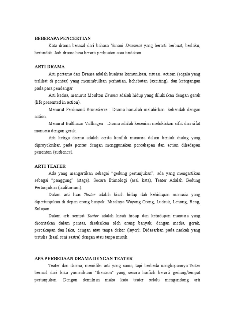 Teater dari segi bahasa theater atau theatre kata teater sendiri berasal dari bahasa yunani theatron yang artinya tempat untuk menonton. Secara istilah teater memilki makna secara luas dan sempit. Pengertian teater dapat kita runut dari melihat arti katanya kata teater secara etimologis berasal dari bahasa inggris theatre dan bahasa yunani theaomai yang berarti dengan takjub melihat dan mendengar.