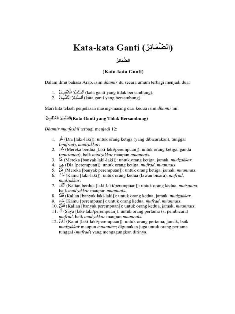 Materi dhamir kata ganti bahasa arab dan penjelasannya lengkap nah jika sahabat blog bba pernah belajar bahasa inggris pasti member tidak asing lagi dengan kata i you they we she he. Nah begitupula dgn bahasa arab. Kata ini sepadan dengan saya aku beta patik dan hamba dalam bahasa melayu.