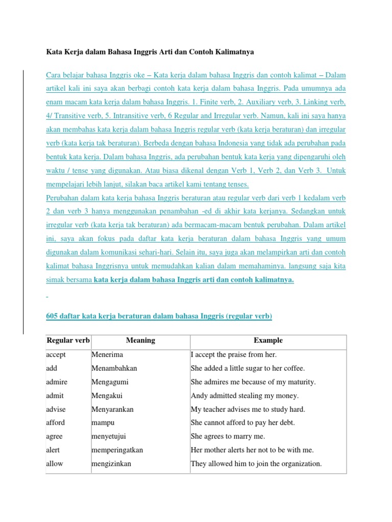 Kata kata kerja bahasa inggris. Dengan kata lain kata kerja bahasa inggris transitive ini adalah jenis kata kerja bahasa inggris yang membutuhkan obyek dalam penggunaan sebuah kalimat. Kata kerja bahasa inggris adalah kumpulan dari regular dan irregular verb yang berisi perubahan bentuk v1 v2 v3 dan v ing beserta artinya. Kata kerja bahasa inggris mengetahui banyak kosakata adalah pondasi utama seseorang dalam menguasai sebuah bahasa tak terkecuali dengan bahasa inggris.