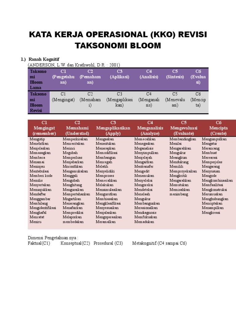 Untuk itu setiap staf pengajar harus mengetahui tiga 3 ranah proses pembelajaran tersebut. 1 k a t a k e r j a o p e r a s i o n a l kata kerja operasional kko edisi revisi teori bloom ranah kognitif mengingat c1 mengetahui. Kko kurikulum 2013 revisi 2018 kata kerja operasional kko revisi taksonomi bloom penggunaan kko digalakkan sejak kurikulum 2013 diterapkan baik revisi 2015 2016 2017 bahkan pada revisi 2018.