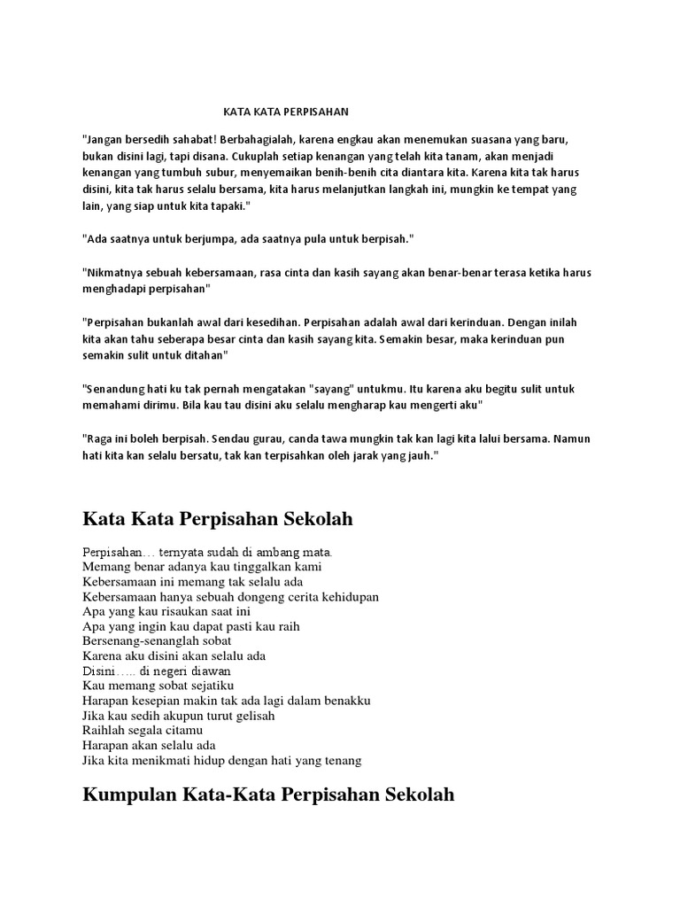Kata kata dan ucapan perpisahan sekolah paling mengharukan untuk teman dan guru oleh munzalan mubarakan 7 may 2016 842 am tak lama lagi para siswa kelas 12 tingkat sma akan meninggalkan bangku sekolah dan seragam abu abu yang selama ini mereka pakai hampir saban hari. Terima kasih juga teman temanku yang tak pernah henti menghiburku. Kata kata perpisahan untuk sahabat sekolah.