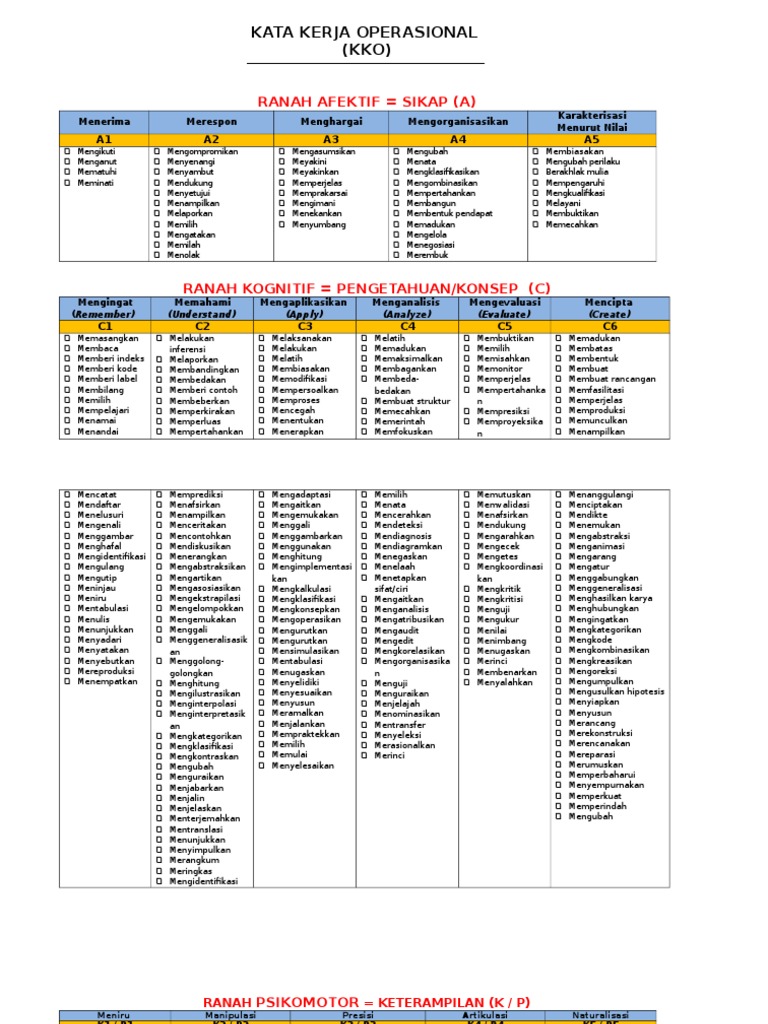 Home wow kata kerja operasional kko kurikulum 2013 kata kerja operasional kko kurikulum 2013 nah teman teman selamat datang di blog supeksa artikel ini akan membahas mengenai kata kerja operasional kognitif afektif dan psikomotor. Format file dan info berikut ini adalah kumpulan dari berbagi sumber tentang kata kerja operasional kurikulum 2013 pdf yang bisa bapakibu gunakan dan diunduh secara gratis dengan menekan tombol download biru dibawah ini. Kata kerja operasional kko kurikulum 2013 aspek kognitif afektif psikomotor kata kerja ranah kognitif c1 c6 kata kerja operasional ktsp kata kerja operasional pdf pengertian kata kerja operasional kata kerja operasional terbaru kata kerja operasional anderson kko k13 pdf kata kerja operasional kurikulum 2013 revisi menurut krathwol 1964 klasifikasi tujuan domain afektif terbagi lima.
