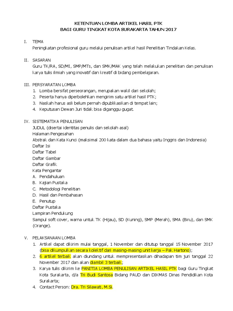 Ketentuan Lomba Artikel Hasil Ptk Bagi Guru Tingkat Kota Surakarta