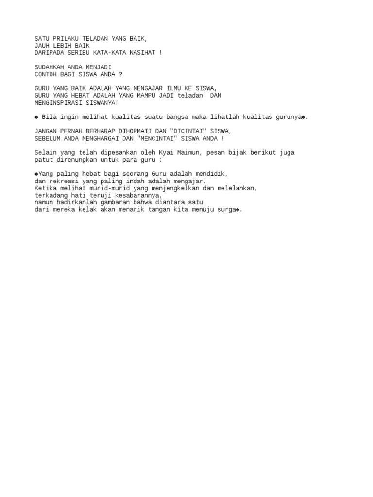 Kata bijak untuk guru ini berisi beberapa petuah dari orang orang bijak yang khusus ditujukan kepada seorang guru.
