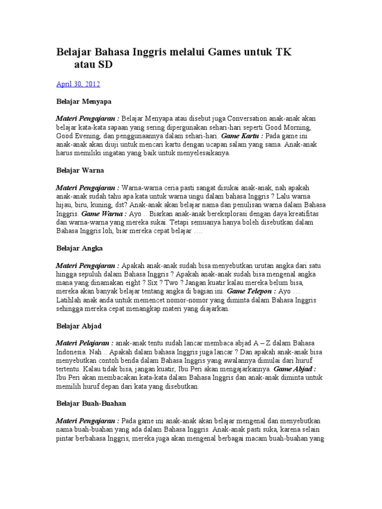 Belajar Bahasa Inggris Melalui Games Untuk Tk Atau