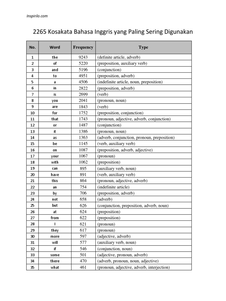 Inilah 2265 kosakata bahasa inggris yang paling sering digunakan baik langsung saja berikut adalah kumpulan kosakata bahasa inggris yang paling sering digunakan. All semua along. Kosa kata paling sering digunakan dalam bahasa inggris dalam kegiatan sehari hari semoga bermanfaat.