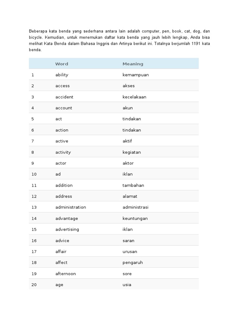 Sebutkan 20 Kata Benda Dalam Bahasa Inggris Terjemah Dalam Bahasa