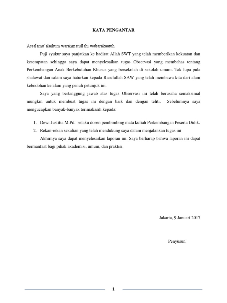 Karena berkat rahmat dan karunia nyalah penulis dapat menyelesaikan laporan observasi ini sesuai waktu yang telah di tentukan. Contoh kata pengantar laporan observasi puji syukur saya panjatkan pada allah swt yang sudah memberi saya kekuatan untuk menyelesaikan laporan observasi mengenai anak yang berkebutuhan khusus di sekolah umum. Saya yang bertanggung jawab atas tugas observasi ini telah berusaha semaksimal mungkin untuk membuat tugas ini dengan baik dan dengan teliti.