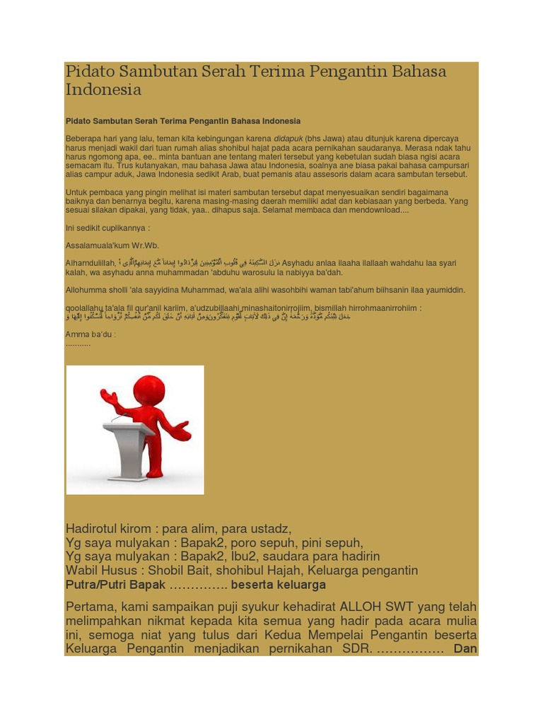 Kali ini asn akan memberikan contoh pidato atau sambutan pada saat pernikahan namun dalam bahasa jawa. Salah satu acara yang biasanya kurang lengkap jika belum ada kata sambutan adalah acara pernikahan. Asumsinya adalah asn mewakili keluarga pengantin wanitakonsepnya pidato yang sederhana diawali dari salam lalu ucapan terima kasih kepada tamu undangan yang hadir dan seterusnya.