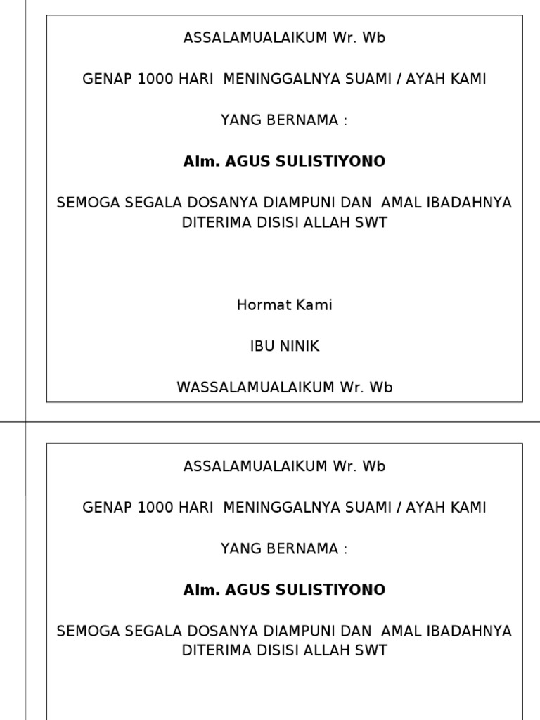 Ucapan 1000 hari meninggalnya ibu. Nek meninggalnya rebo wage mendak pindonya apa yah ada contoh ucapan tulisan di penutup box kenduri 1000hari org. Contoh surat undangan tahlil 40 100 1000 hari haulfull description. Saya kebagian tugas membuat kartu ucapan terima kasih kartu peringatan 1000 hari yang biasanya dimasukkan ke dalam nasi kotak yang dibagikan ke tetangga dan saudara.