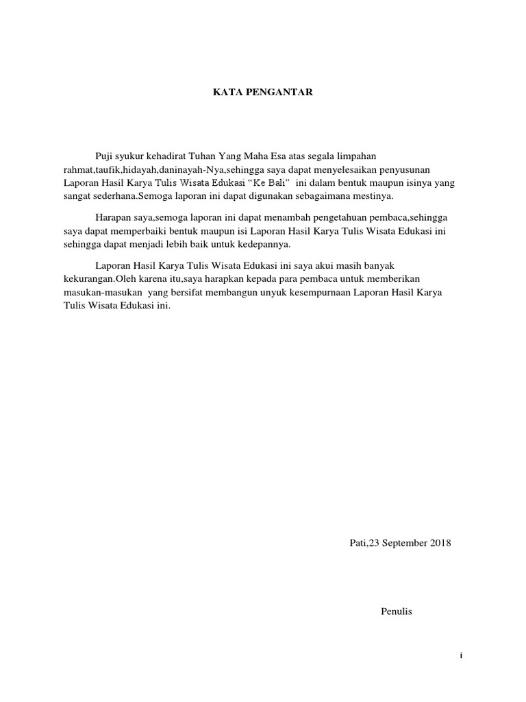 Kata pengantar laporan study tour. Biasanya kata pengantar ini digunakan dalam membuat makalah laporan skripsi proposal dan bahkan di dalam surat. Kata pengantar laporan kkn diperlukan saat anda membuat laporan kkn. Kata pengantar adalah bagian terpenting yang tidak bisa dilewatkan dari sebuah makalah atau laporan.