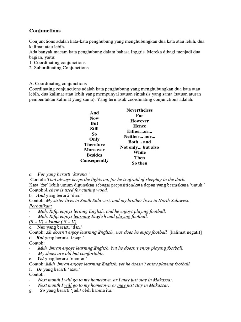 Kata penghubung dalam bahasa inggris. Kata penghubung atau conjunction adalah bagian penting di dalam sebuah bahasa termasuk bahasa inggris. Jenis dan contoh conjunction dalam bahasa inggris coordinating conjunction adalah kata penghubung yang menghubungkan kalimat satu dengan yang lainnya yang sederajat. 24 daftar kata penghubung dalam bahasa inggris dan artinya.
