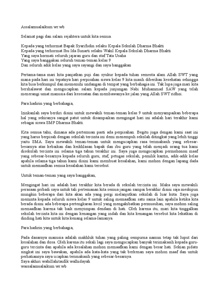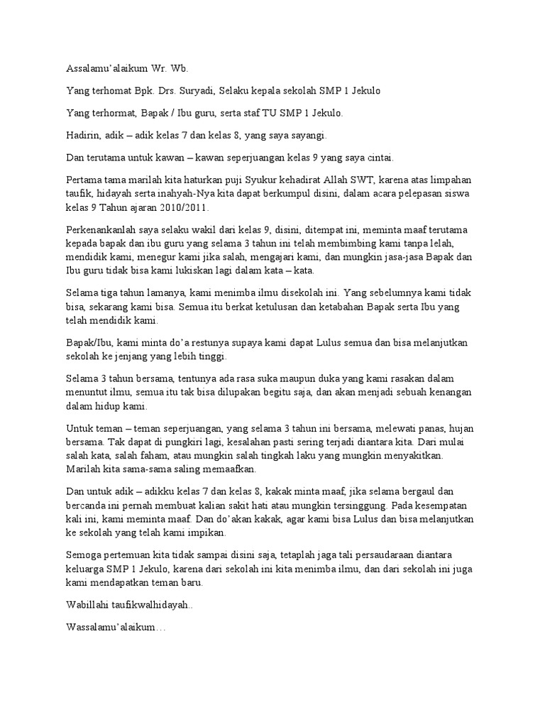 5 contoh puisi perpisahan smp kelas 9 puisi merupakan bentuk tulisan mengenai penggambaran terhadap sesuatu objek yang tetap tersusun antara unsur fisik dan batinnya. Contoh pidato perpisahan panjang kelas 9 assalamualaiku wr wb bapak kepala smp negeri 1 ciawigebang yang saya hormati. Bagi anda yang tidak bisa merangkai kata kata yang indah untuk di berikan kepada dia pada saat terakhit.