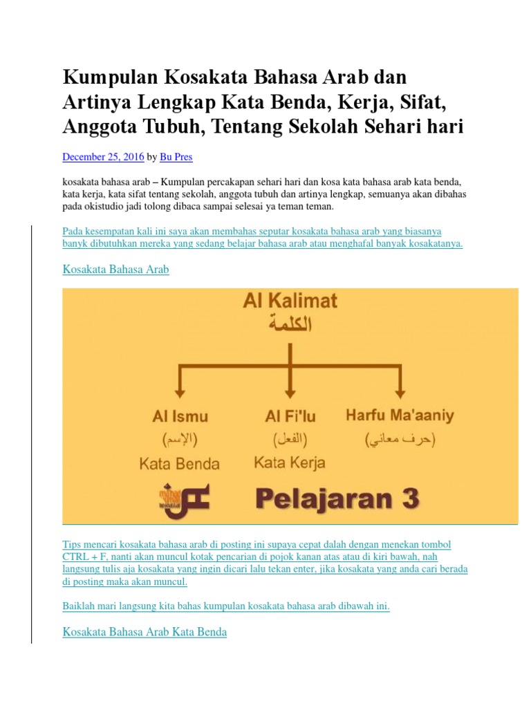 Kosakata bahasa arab kata benda teman teman yang sedang belajar bahasa arab tentunya harus banyak menghafal mufrodat atau kosa kata bahasa supaya bisa melatih bahasa arab yang sudah dikuasai dengan cara membuat kalimat atau percakapan. 1001 kosakata bahasa arab dan artinya terlengkap. Nah disini akan ada tiga kolom dimana kolom pertama adalah bahasa arabnya lalu bacaannya dan juga artinya dalam bahasa indonesia.