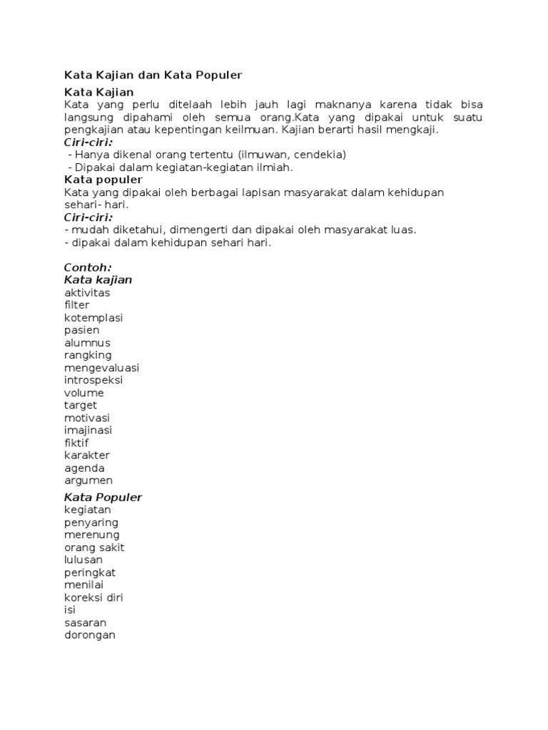 Kata kajian dan kata populer. Pengertian kata kajian dan kata popular kata kajian adalah kata yang digunakan secara khusus oleh ilmuan dan kelompok terpelajar yang biasanya digunakan dalam karya ilmiah. Pengertian dan contoh kata kajian dan pengertian kata populer banyak sudah jenis kata yang telah kita bahas dalam beberapa waktu yang lalu namun masih banyak pertanyaan pertanyaan yang kami terima terutama pertanyaan tentang pengertian dan contoh kata kajian dan pengertian kata populerpada kesempatan kali ini kami akan coba menjelaskan secara singkat tentang pengertian dan contoh kata. Kata kajian kata yang perlu ditelaah lebih jauh lagi maknanya karena tidak bisalangsung dipahami oleh semua orang.