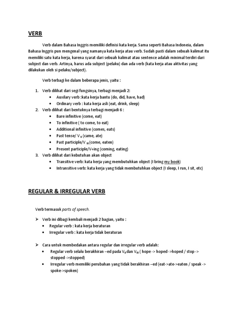 Kata beraturan atau regular verbs di dalam bahasa inggris adalah kelompok kata kerja yang bentuk perubahan verb 2 dan verb 3 nya mengikuti aturan yang baku yaitu dengan memberi akhiran ed. Komplit banget deh pokoknya. Verb sendiri dalam bahasa indonesia berarti kata kerja dalam artian merupakan sebuah kata yang berfungsi menunjukan tindakan dari subjek peristiwa atau tindakan.